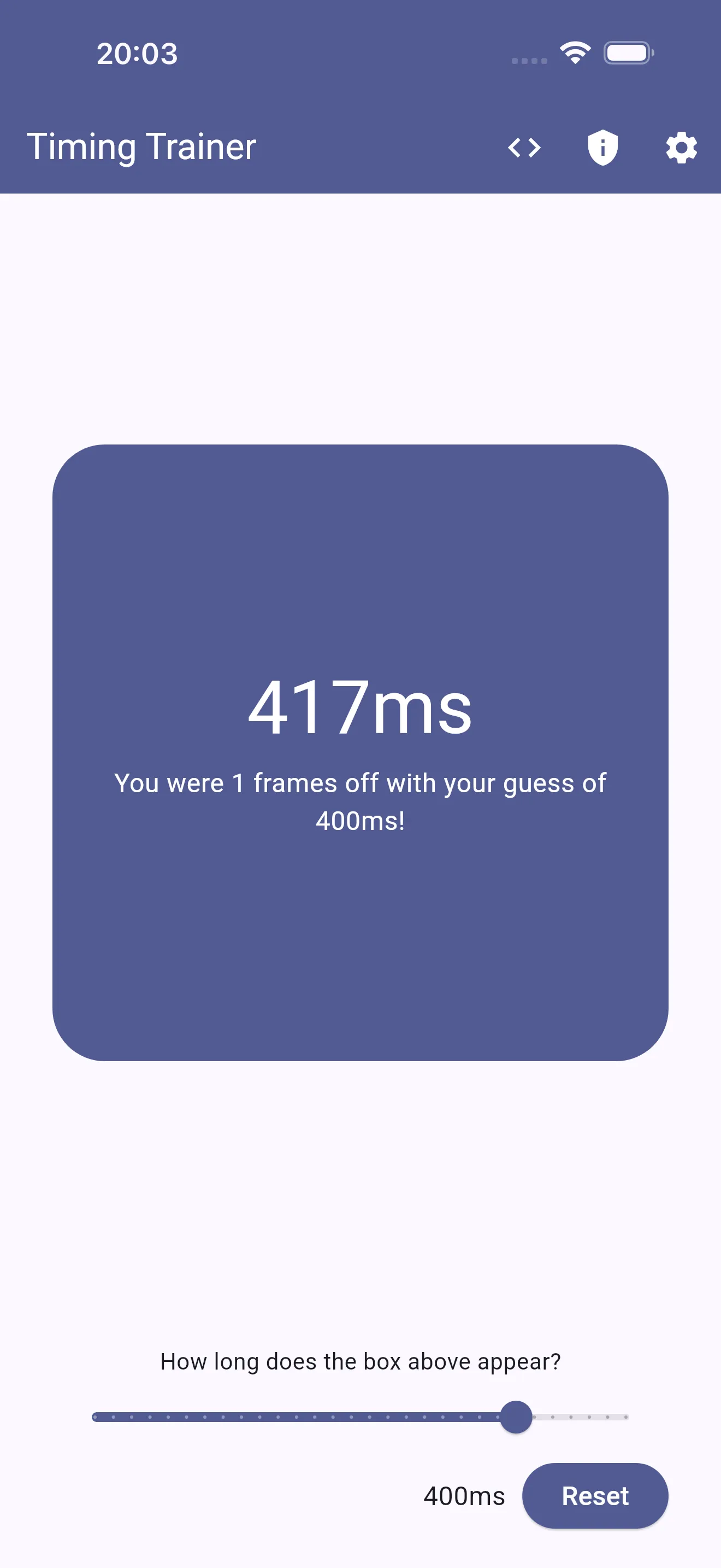 Timing Trainer presents you with a blinking square and you guess the time between blinks. As you play, you'll get better at recognizing sub-second intervals.