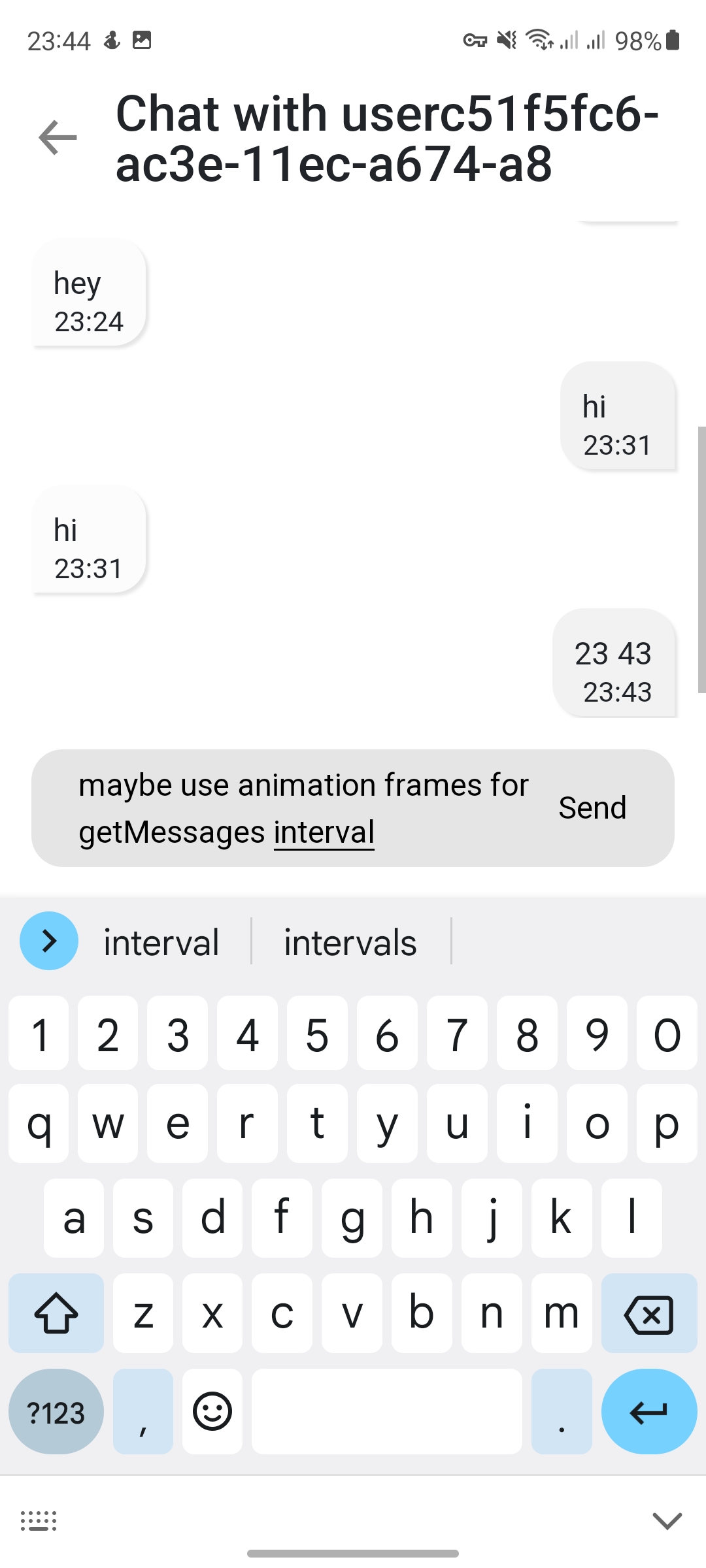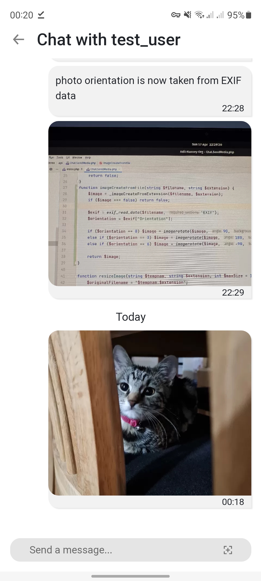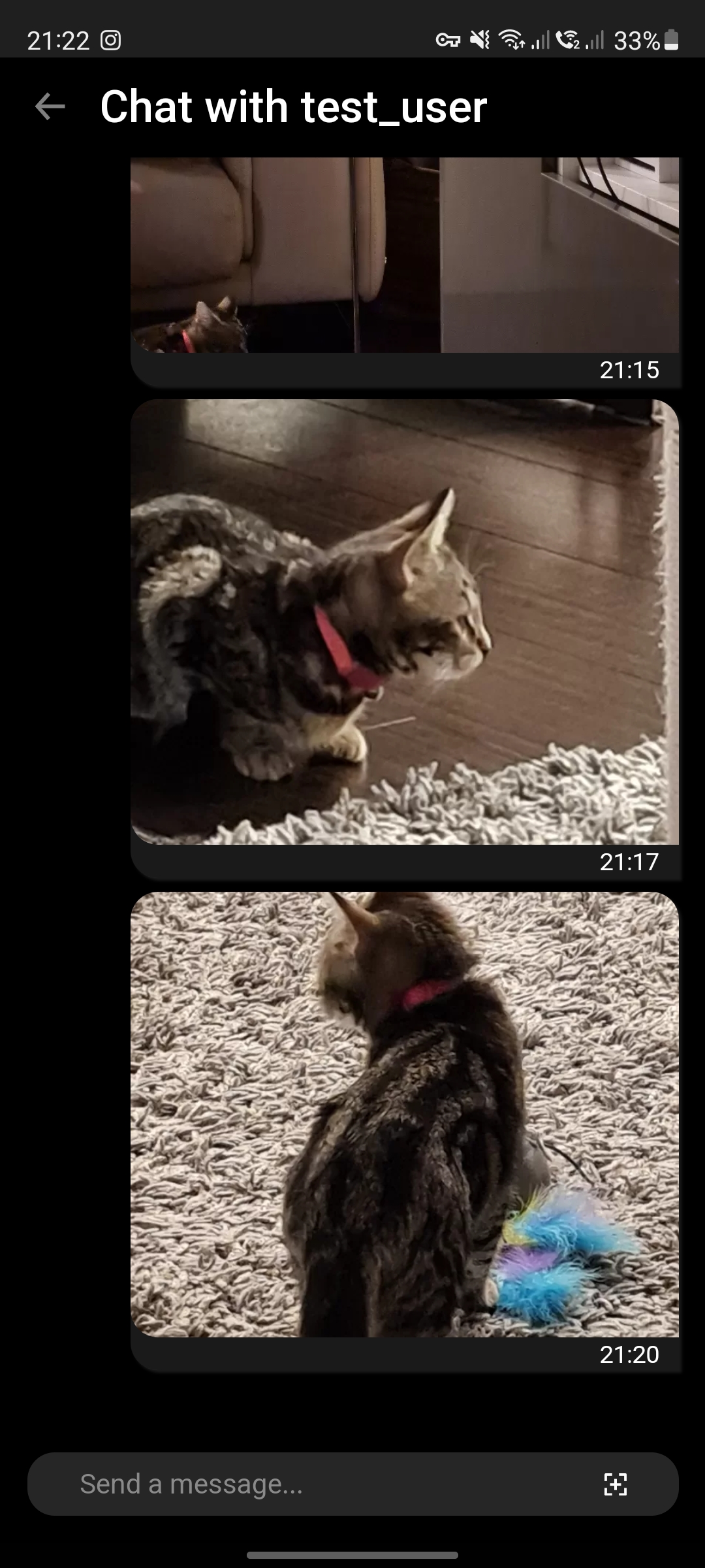 It had a Snapchat-like layout where you could swipe between the camera, chats, and feed. I only implemented the chat functionality and used it to chat with my friends for a while. I tested it with lots of cat pictures as you can see in the screenshots!