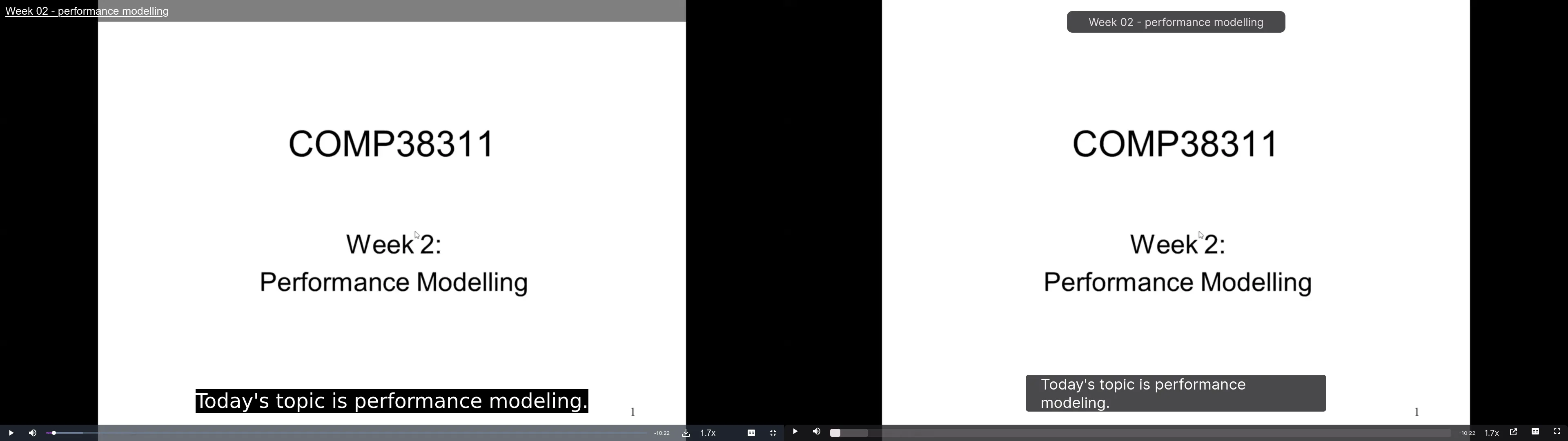 One of the most improved areas is the video player. The course content videos were difficult to use as you had to use the mouse to click on the buttons to play/pause, click somewhere on the razor-thin progress bar to rewind, and go through a series of popups and dialogs to configure captions at the start of every video! I emailed the university about this, but didn't get a response, so I decided to fix it myself. I added the standard keyboard shortcuts for play/pause, rewind/fast-forward, volume control, captions, and fullscreen. I also set sensible defaults, including a larger font size, better fonts, and a smaller width so your eyes don't have to move as far to read the captions. I also changed the upscaling algorithm to favour sharpness over smoothness, as the fuzziness of lower quality videos was harder to read.