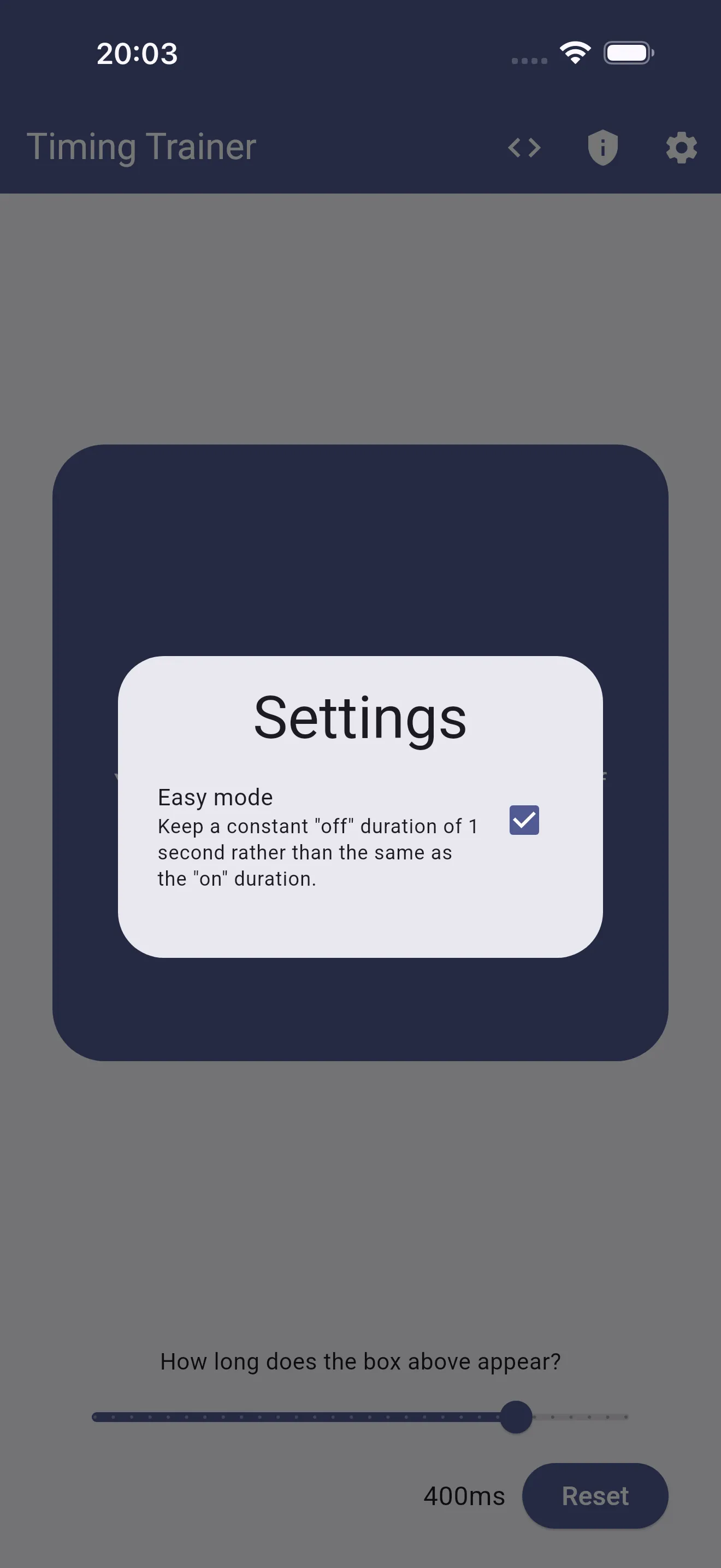 Timing Trainer presents you with a blinking square and you guess the time between blinks. As you play, you'll get better at recognizing sub-second intervals.